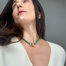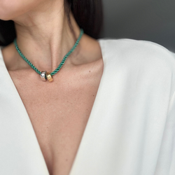 FLUID Deep Green Silk Rope Necklace/Choker With Silver & Gold Pendants